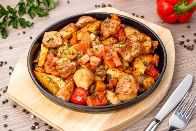 Жаркое из курицы с помидорами и сладким перцем 550 ₽ В корзину В корзину Картофель, лук репчатый, сладкий перец, помидоры, куриное филе, зелень Картофель, лук репчатый, сладкий перец, помидоры, куриное филе, зелень