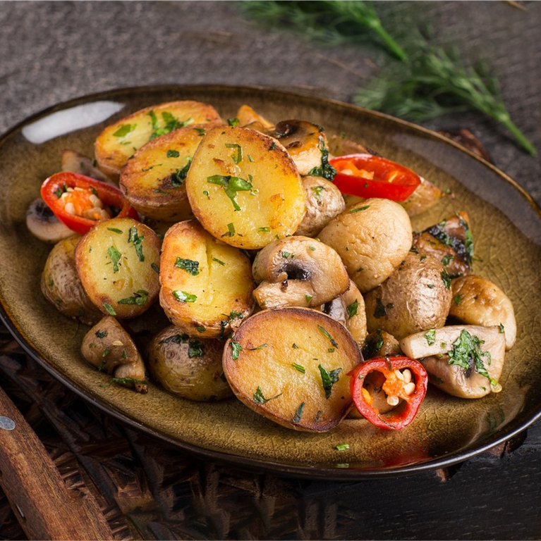 Картофель жареный с грибами 550 ₽ В корзину В корзину Картофель, шампиноны,лук репчатый, зелень. Пищевая ценность в 100г - 116 ккал Вес 350 г Картофель, шампиноны,лук репчатый, зелень. Пищевая ценность в 100г - 116 ккал Вес 350 г